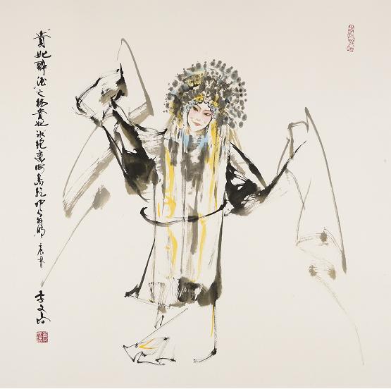 其中,《贵妃醉酒》是李文培最著名的作品系列。该剧又名《百花亭》,源于清乾隆时花部地方戏《醉杨妃》的京剧剧目。李文培画中的贵妃身着华袍、容颜娇俏,却难掩酒后凄凉之态。